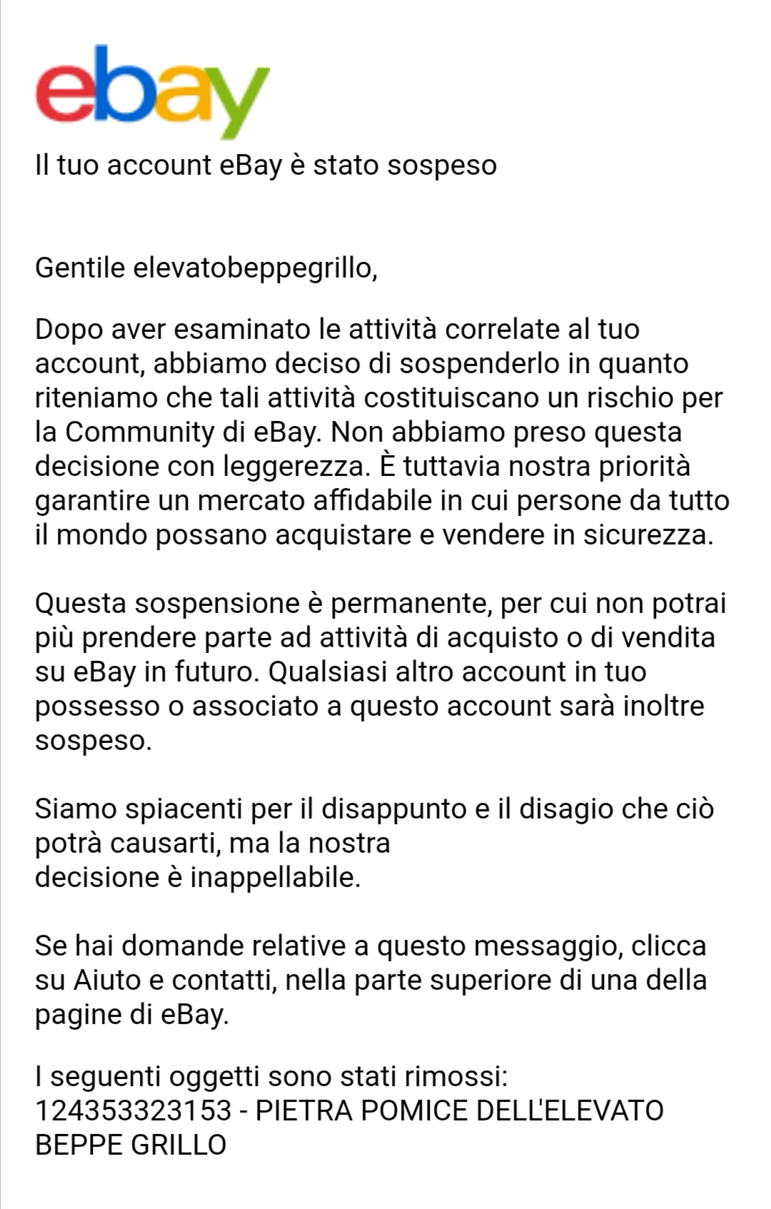 Una provocazione, una delle tante nella carriera del comico genovese, che qualcuno ha però segnalato ad eBay che senza pensarci due volte ha cancellato l’account di Grillo. “Gentile elevatobeppegrillo, dopo aver esaminato le attività correlate al tuo account abbiamo deciso di sospenderlo in quanto riteniamo che tali attività costituiscono un rischio per la community di eBay”, è il messaggio inviato a Grillo, che lo ha pubblicato sul suo profilo Facebook.