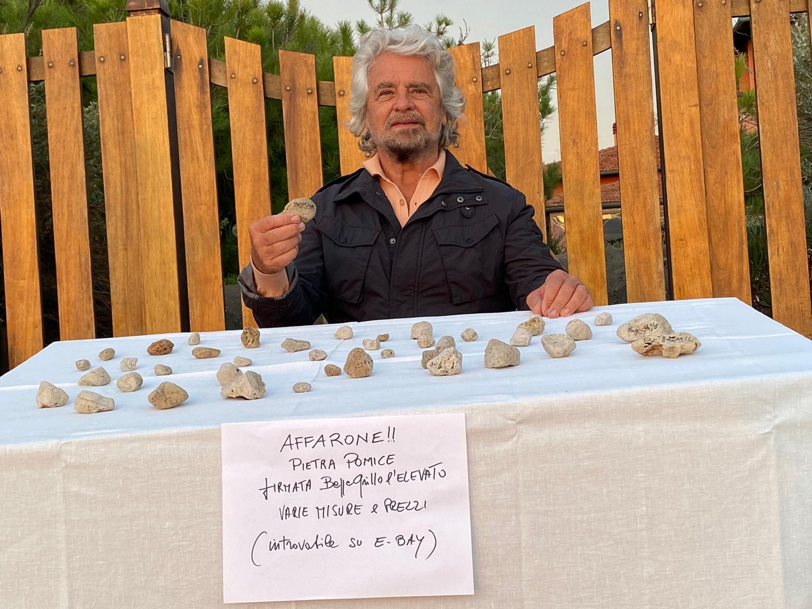 Nella notte quindi Grillo è tornato all’attacco e sempre su Facebook ha pubblicato una foto di un ‘banchetto’ improvvisato per la vendita della pietra pomice, definita ironicamente “introvabile su eBay”.