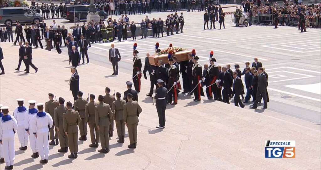Gli onori militari verranno tributati al feretro all’ingresso e all’uscita della Cattedrale milanese in presenza di un rappresentante dello Stato, in questo caso lo stesso presidente Mattarella, con una corona in posizione di rilievo rispetto alle altre, e la recita di un’orazione commemorativa ufficiale.