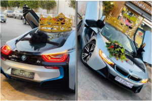 Sul web sono apparse le foto dello sposo che appare felice e spensierato in un abito bianco. Della moglie non si sa nulla e non è presente nemmeno in una foto. Invece, non manca la foto della macchina degli sposi. Una bmw spider nuova e color grigio alla quale è stata messa sopra una corona enorme.
