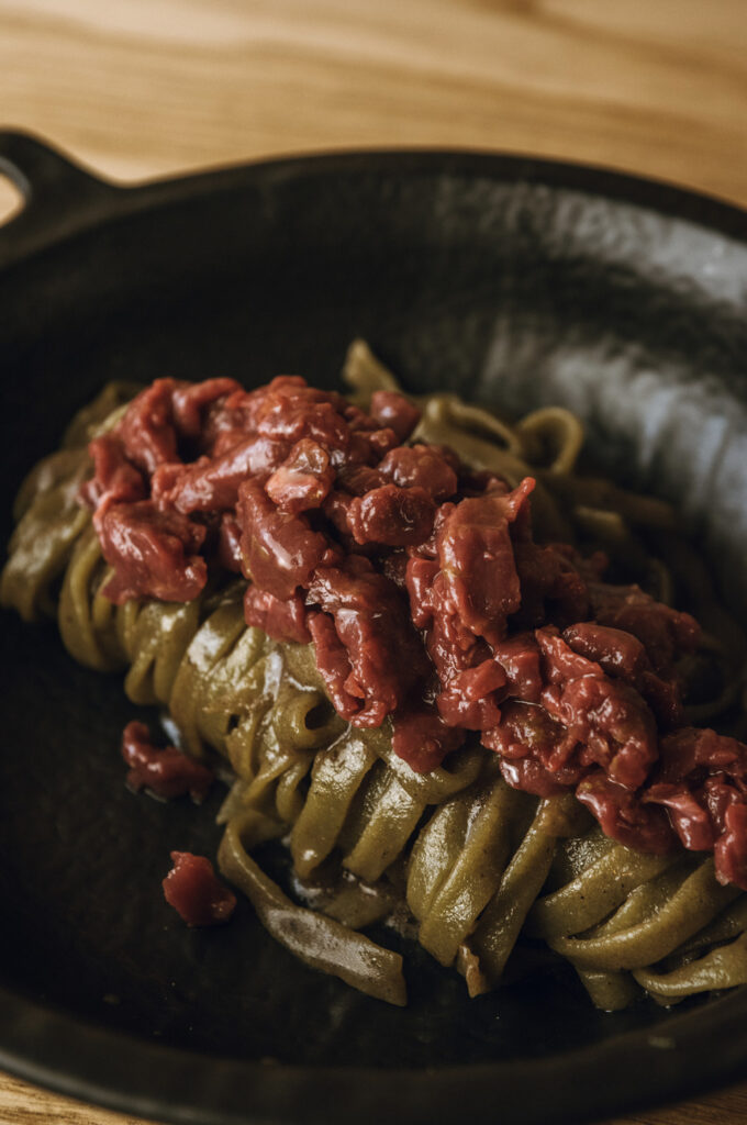 Piatti che sappiano di casa, di tradizione, senza manipolare eccessivamente le materie prime, ricercando gli elementi del bosco da valorizzare attraverso la semplicità: la cucina di Simone Cacciotti dalla Tagliata di selvaggina, una proposta che rappresenta tutti i valori, etici e gastronomici, dello chef e di Brado. Il lavoro di creazione del menu inizia ben prima che in cucina, cercando e selezionando i migliori fornitori per costruire una dispensa con pochi eguali. Da La Macelleria Zivieri, di Aldo Zivieri, che da anni svolge un lavoro di grande importanza con la selvaggina, portando avanti il progetto della filiera di queste carni, ad Agricola Nera, azienda di Narni, che alleva maiali di Cinta Senese ed avicoli in totale libertà, da L’Azienda I Sapori di Caccia Toscana di Salvatore Leanza che cura la selezione di salumi di selvaggina, lavorati completamente al naturale come una volta a L’azienda agricola La Mascionara, situata sull’Altopiano di Campotosto nel parco Nazionale d’Abruzzo e Monti della Laga, alleva pecore in totale libertà a 1400 metri di altitudine.