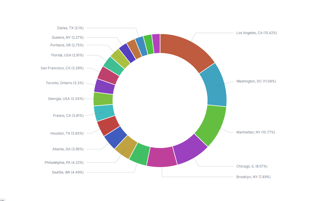 Guardando le prime 20 città più attive sul fronte della protesta, si nota come la città di Minneapolis sia sparita dai radar mentre Los Angeles, dove è stata divelta la stella di Trump nella Hall of Fame di Hollywood, svetti sopra Whashington. La somma di Manhattan e Brooklyn però mette New York al primo posto come luogo delle proteste virtuali. Anche in questo caso l’unica città presente in graduatoria che non si trova negli States è la canadese Toronto.