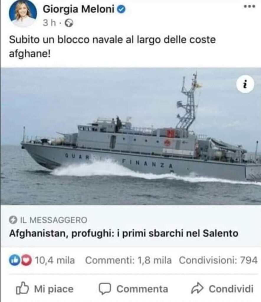 Una bufala costruita ad arte: da una parte una dichiarazione verosimile, dall’altra la ‘shitstorm’ nei confronti della numero di FDI, offesa e accusata per l’ovvio e clamoroso errore geografico, dato che l’Afghanistan come noto non ha alcun sbocco sul mare e quindi alcuna costa.