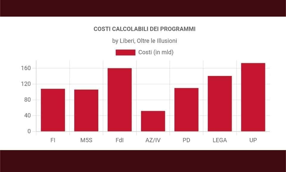 Ebbene la cosiddetta “agenda Robin Hood” di Unione Popolare (rinvio per questo a un articolo analitico di Piero Bevilacqua) fa assommare a 27 miliardi la cifra necessaria per realizzare tutte le nostre proposte [stando invece alla famosa dichiarazione fatta da Luigi De Magistris al direttore di Fanpage: “non siamo qua col misurino, 40-50 miliardi di euro da spostare da una parte a metterli dall’altra», e l’associazione Liberi oltre le illusioni ha calcolato il costo dell’agenda di Up in oltre 160 miliardi di euro, grafico qui sotto, ndg], tutte, a cominciare da una campagna straordinaria di assunzioni in ruolo nella sanità pubblica, nella scuola, negli Ispettorati del lavoro etc., anche per combattere la terribile disoccupazione giovanile e le morti sul lavoro. Ebbene, tale cifra può provenire ad abundantiam (a) da una tassa patrimoniale dell’1% sui grandi patrimoni (ho detto “grandi”: non si nascondano la destra e il centrosinistra dietro la vecchietta proprietaria della propria casa!); (b) da una riduzione del 10% della colossale evasione fiscale che ammonta a 100 miliardi circa; (c) da una riduzione sostanziosa delle spese militari che tutti, centro-sinistra, destra e M5S hanno aumentato e intendono aumentare ancora.
