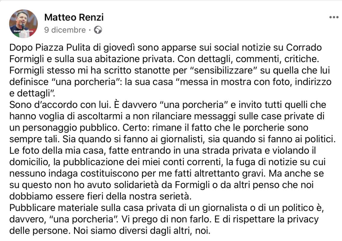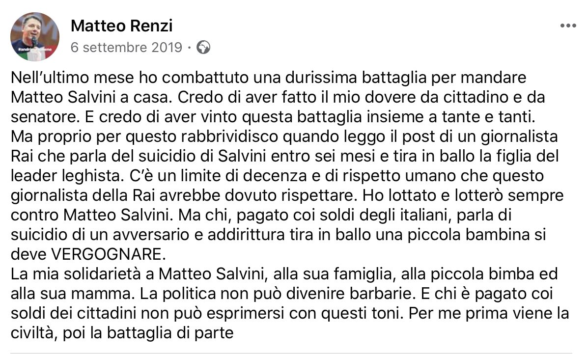 Dispiace doversi trovare, in un momento come questo, a dover ancora commentare la diffusione di fake news. La macchina del fango contro Matteo Renzi non va in quarantena, a quanto pare. In queste ore, infatti, in rete sta girando un video di appena due minuti e mezzo, ripreso dal cellulare di un presunto vicino di casa dell’ex Premier, dove appare (molto chiaramente per altro) la famiglia Renzi a giocare nel proprio giardino di casa. Per un motivo o per l’altro, questo signore denuncia il fatto che ‘ogni giorno gli amici dei figli di Renzi vengano accompagnati dagli uomini della scorta del padre a giocare a pallone, violando le norme di sicurezza’. Dotatevi di un cellulare e di un cervello pensante e capirete da soli come stanno le cose. Tuttavia non voglio soffermarmi troppo sulla persona che ha diffuso il filmato. Non penso meriti tutta l’esposizione mediatica che sta ricevendo e che, probabilmente, ricercava. Pagherà in un’aula di tribunale per il reato (sì, reato) che ha commesso. Il punto è un altro. Penso sia giunto il tempo di interrogarsi sui motivi che spingono queste persone a sentirsi quasi in dovere, oltre che in diritto, di mostrare al mondo la vita privata dei nostri politici. Mischiare la vita pubblica, la vita lavorativa, con quella privata. Dare in pasto all’oceano di squali di Twitter dei minorenni. Assurdo e inaccettabile.