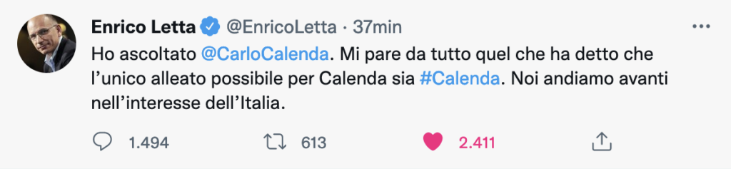 Allora immaginavo almeno la costruzione di un polo libdem di Centro con Italia Viva. Oggi non mi pronuncio: il capitale di credibilità di Calenda è ridotto al minimo dopo aver siglato un patto e averlo rotto nel giro di una settimana, e penso che sia ormai chiaro ai più che Calenda è un parvenu della politica, e che il livello della sua amatorialità, della sua impoliticità è tale per cui questa carriera non può essere la sua.