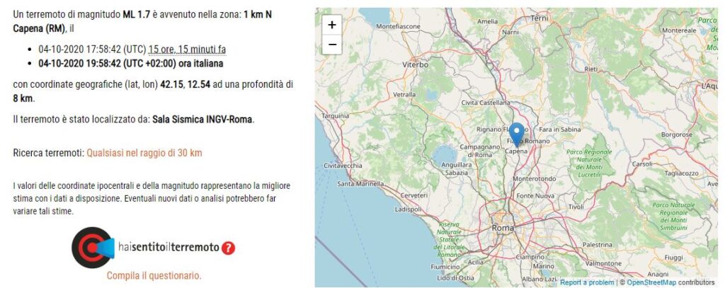 Un fortissimo boato che la scorsa notte ha svegliato l’intera cittadinanza non solo di Capena, una cittadina alle porte di Roma, ma di tutto il quadrante nord-est della capitale e che si è fatto sentire anche dai sismografi dell’Istituto nazionale di geofisica e vulcanologia, che poco prima delle 20 di domenica hanno registrato un fenomeno sismico di magnitudo 1.7 con epicentro a Capena e profondità di 8 chilometri.