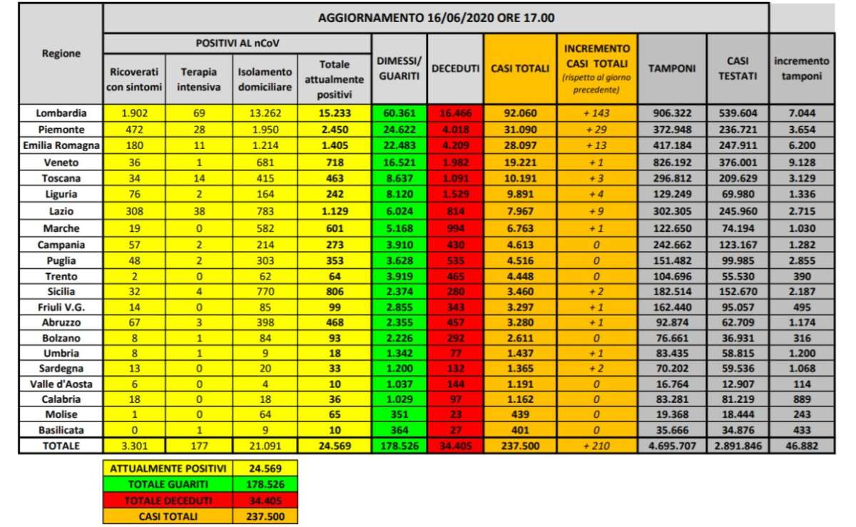 Sono 210 nuovi casi di coronavirus registrati in Italia nelle ultime 24 ore, secondo il bollettino della Protezione civile di oggi. In calo, contro i 303 di ieri, per un totale di 237.500 casi dall’inizio dell’epidemia di Covid-19. A pesare, sono ancora i numeri della Lombardia, che oggi fa segnare 143 nuovi casi (68%) contro i 259 di ieri. Dati positivi soprattutto se rapportati al numero di tamponi, 46.882 contro i 28.107 di ieri.