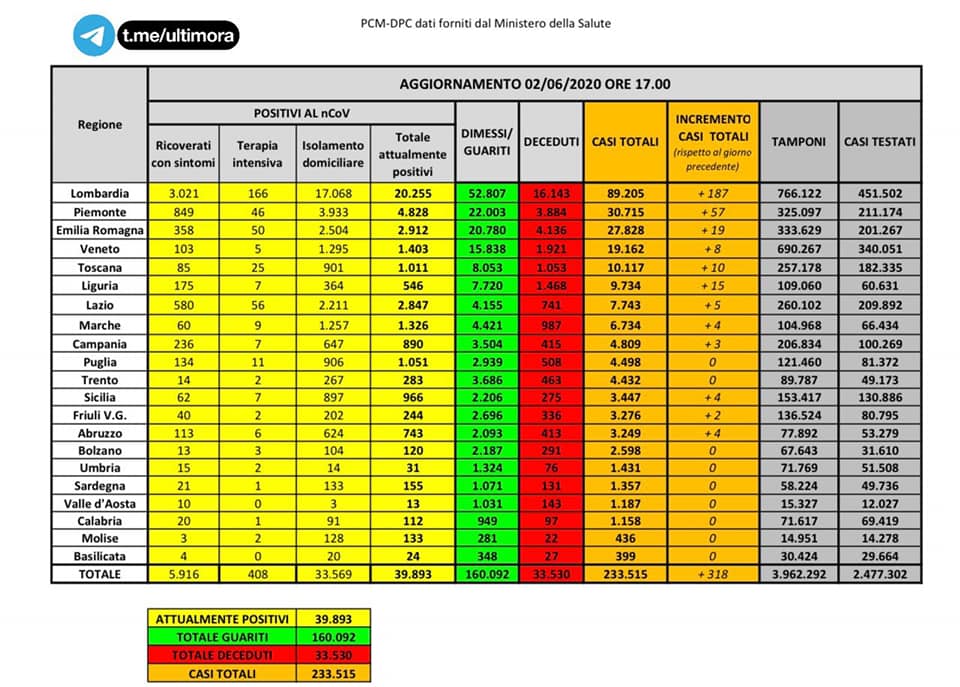 Nel bollettino del 2 giugno diffuso dalla Protezione Civile, dei 318 tamponi positivi ben 187 provengono dalla Lombardia, segue il Piemonte con 57 casi, l’Emilia Romagna con 19 casi, la Liguria con 15. Zero i contagi in otto regione: Valle d’Aosta, Trentino Alto Adige, Umbria, Molise, Basilicata, Puglia, Calabria, Sardegna.