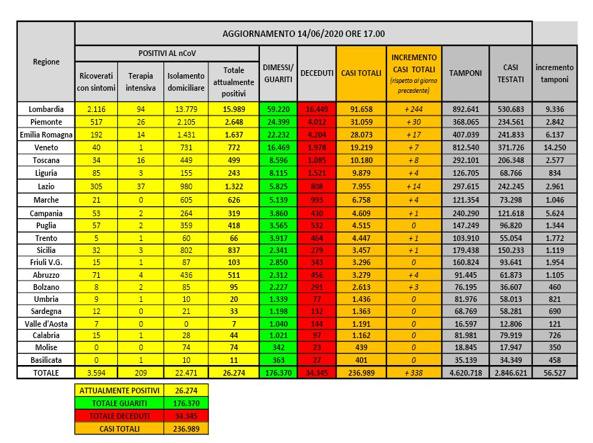 Il totale dei positivi risulta essere di 236.989 contagiati; le vittime 34.345. I malati attualmente di coronavirus in Italia sono 26.274, 1.211 in meno rispetto a ieri. Sono saliti a 176.370 i guariti e i dimessi, con un incremento rispetto a ieri di 1.505. Venerdì l’aumento era stato di 1.780. Oltre 56mila tamponi sono stati processati.