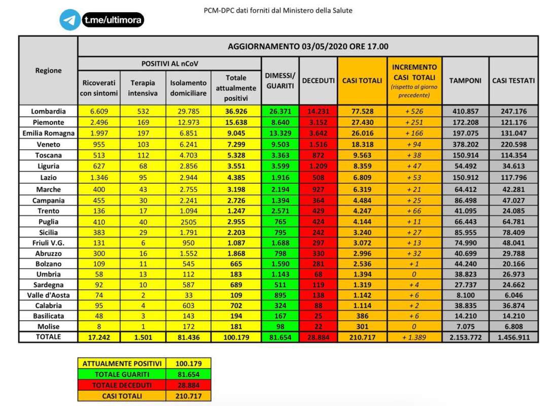 I morti registrati nelle ultime 24 ore sono 174 (totale 28.884) mentre il totale delle persone che hanno contratto il virus è 210.717, con un incremento rispetto a ieri di 1.389 nuovi casi su 44.935 tamponi analizzati. Il numero degli attualmente positivi è di 100.179, con una decrescita di 525 assistiti rispetto a ieri.