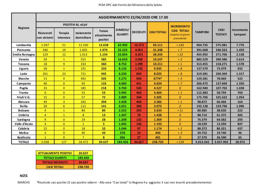A oggi il totale delle persone che hanno contratto il virus (nel computo ci sono anche i morti e i guariti) è di 238.833, con un incremento rispetto a ieri di 122 nuovi casi. La maggior parte sono in Lombardia, con 62 nuovi positivi, il 50,8% dei nuovi contagi.