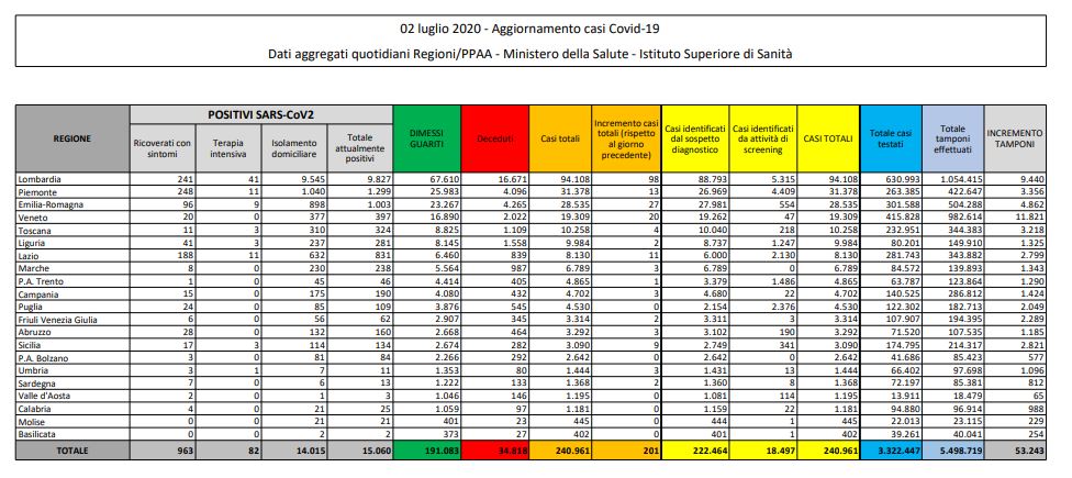 Per il quarto giorno consecutivo sono in aumento il numero di nuovi casi di contagio in Italia. Nel bollettino pubblicato oggi dal Ministero della Salute sono infatti 201, di cui 98 nella sola Lombardia (ieri erano 187), col totale che sale così a 240.961 malati Covid dall’inizio dell’epidemia.