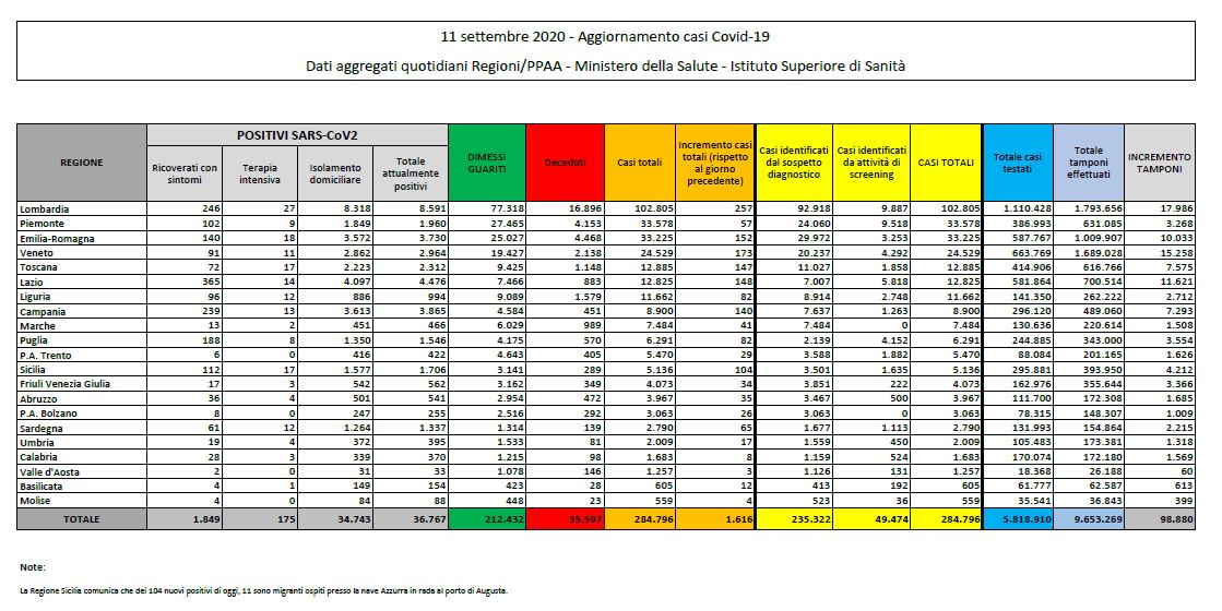 I guariti oggi sono 547 (ieri 613) per un totale di 212.432, mentre i tamponi effettuati nelle ultime 24 ore sono stati 98.880 contro i 94.186 di 24 ore fa, col totale da inizio emergenza arrivato a 9.653.269.