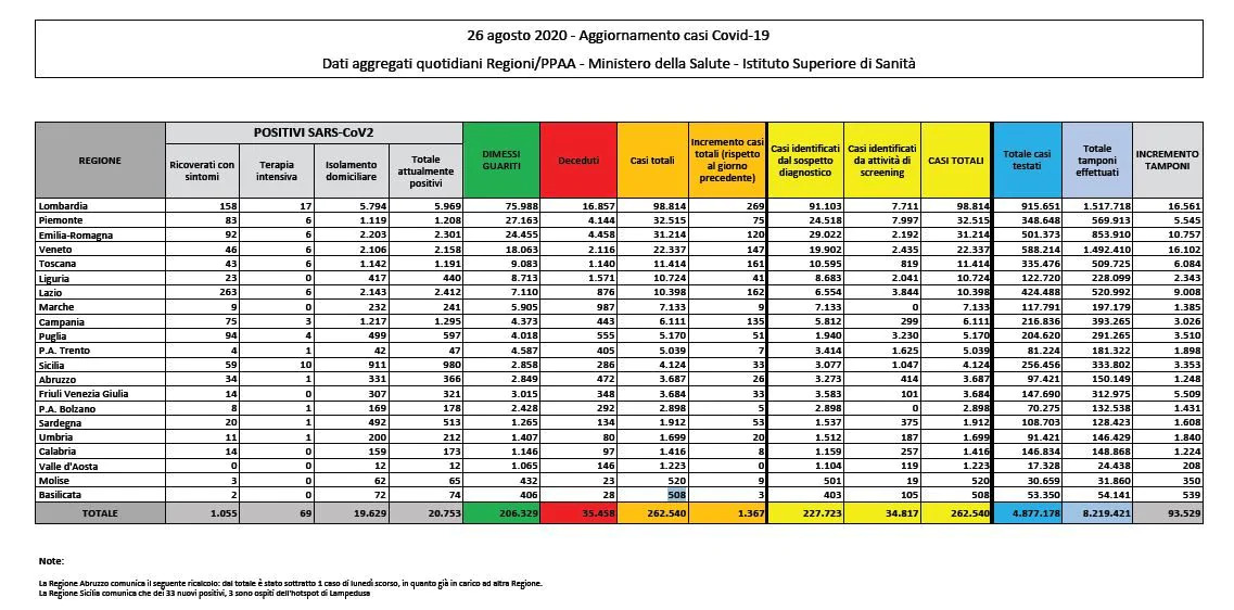 Nuovo boom di nuovi positivi al coronavirus dopo il calo del bollettino di ieri. Il resoconto di oggi, mercoledì 26 agosto, riporta infatti 1.367 nuovi contagi conto gli 878 di ieri. Il dato, registrato nelle ultime 24 ore, è il più alto dagli inizi di maggio. Tredici i morti, nove in più rispetto ai quattro di ieri.