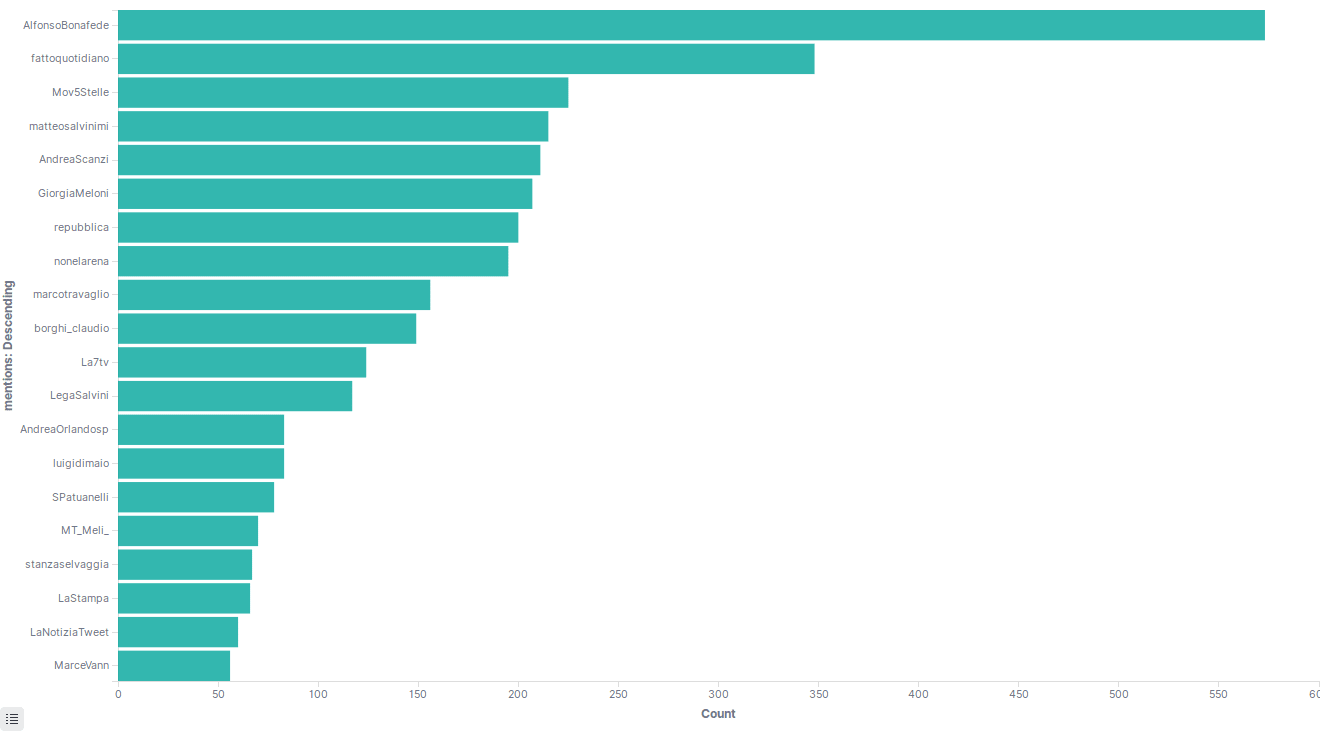 MENZIONI – I protagonisti del dibattito politico sono stati oltre al Ministro Bonafede, anche l’account del Movimento 5Stelle ed il Fatto Quotidiano colpiti dal turbine di polemiche insorte in favore di Di Matteo. Seguono gli onnipresenti Matteo Salvini e Giorgia Meloni con un Andrea Scanzi di mezzo, soccorso a dare una mano al Guardasigilli della Repubblica Italiana. La7 e Non è l’Arena, autori dello scoop giornalistico, hanno destato solo un interesse iniziale, occupando stabilmente la metà classifica. Anche Andrea Orlando figura tra i menzionati di spicco, autore di una dichiarazione che ha “assolto” contribuendo a mettere acqua sul fuoco.