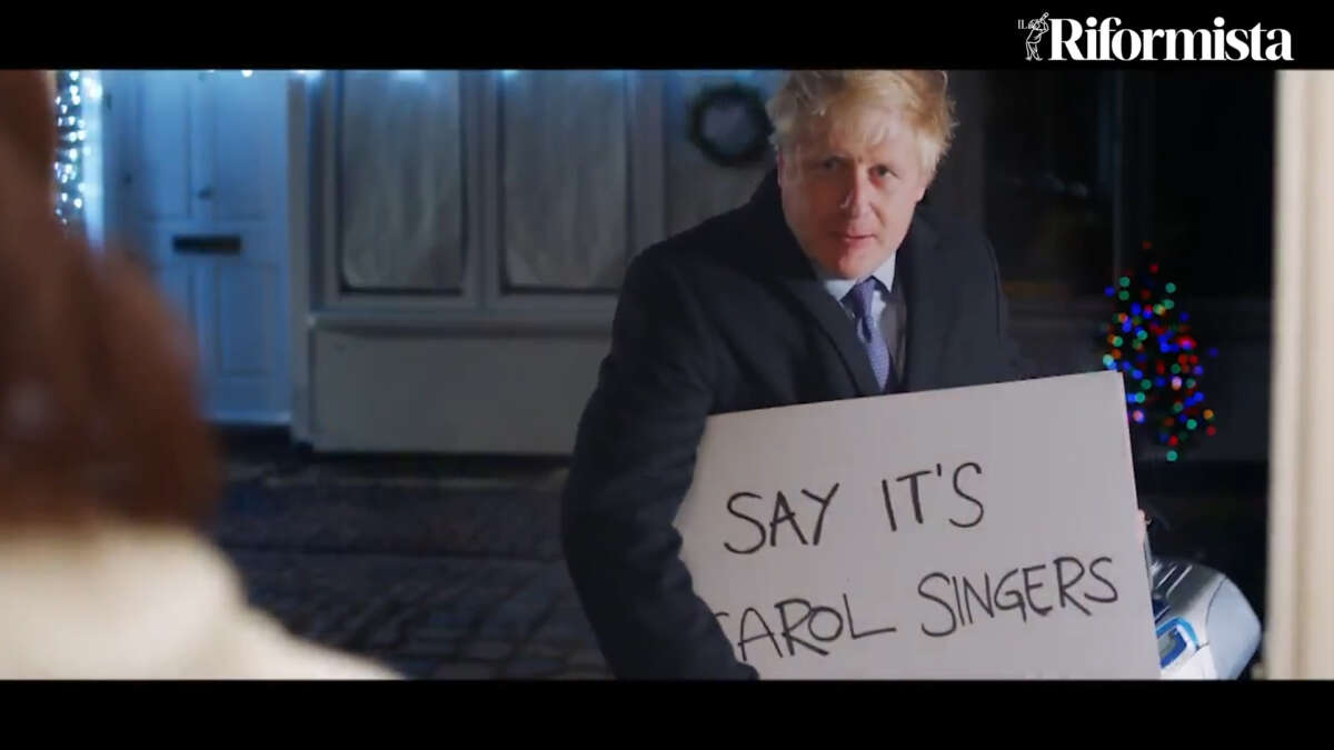 Lei bianca, lui di colore, stanno sul divano a guardare la tv. Poi qualcuno bussa alla porta e lei scende ad aprire. Fuori trova un uomo con uno stereo con la musica dei canti di natale e il cartello “Dici che sono i cantori”. È questa una delle scene più famose del film classico di Natale “Love Actually”. Questa volta il protagonista della scena non è Hugh Grant, come già successo qualche giorno fa, ma Boris Johnson.