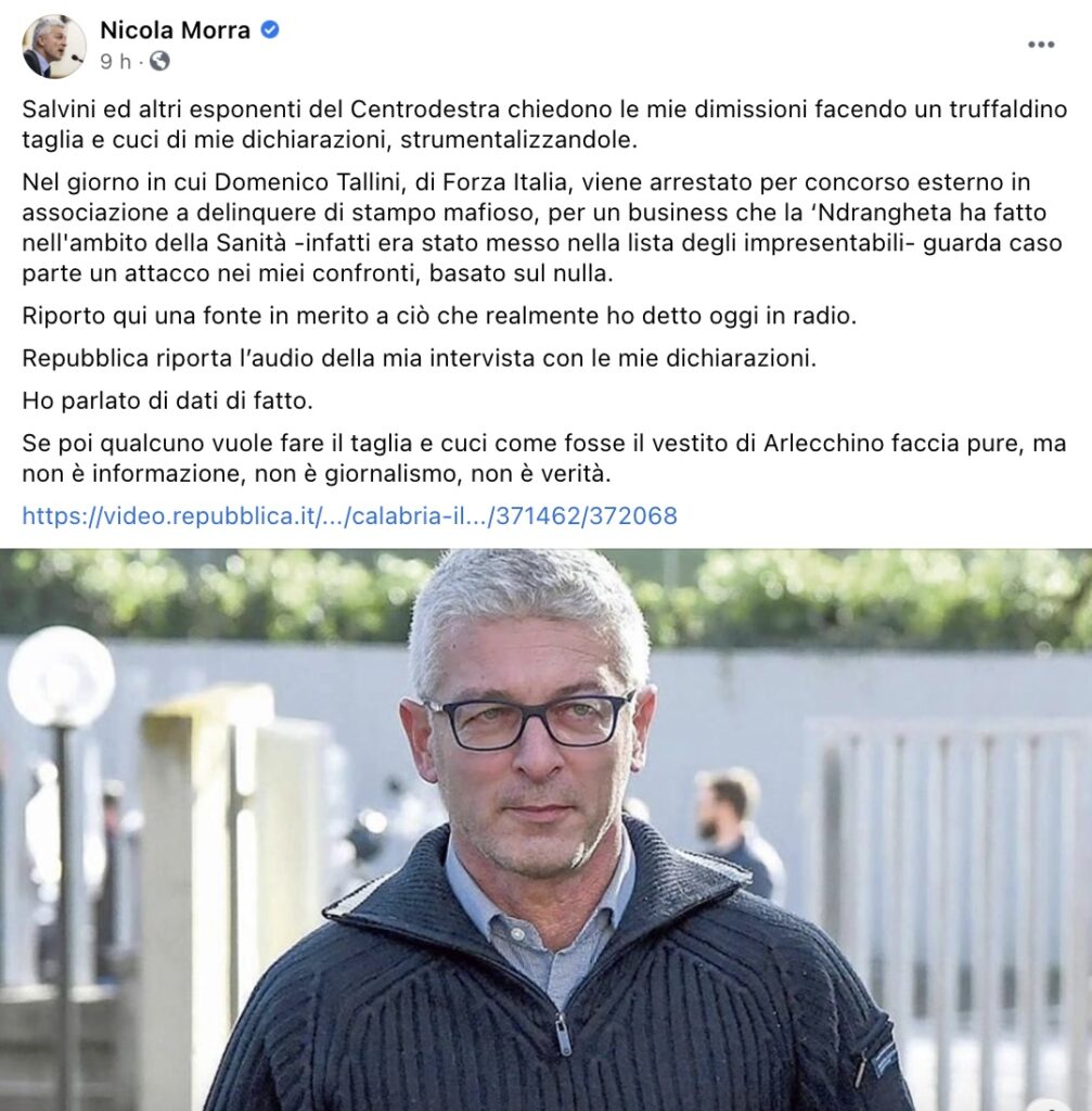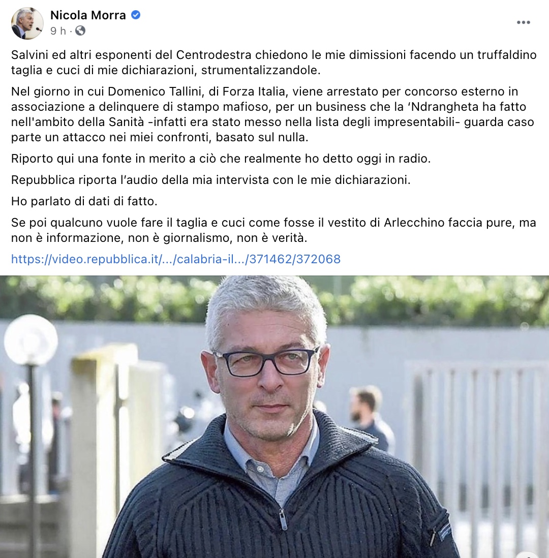 Una polemica che ha spinto il diretto interessato a prendere posizione nella serata di giovedì, replicando alle accuse piovute dal centrodestra. Su Facebook il presidente della Commissione antimafia ha accusato Salvini e gli altri esponenti del centrodestra di aver fatto “un truffaldino taglia e cuci di mie dichiarazioni, strumentalizzandole”. Morra quindi riporta un link a Repubblica in cui vi è l’audio dell’intervista, aggiungendo: “Ho parlato di dati di fatto. Se poi qualcuno vuole fare il taglia e cuci come fosse il vestito di Arlecchino faccia pure, ma non è informazione, non è giornalismo, non è verità”.