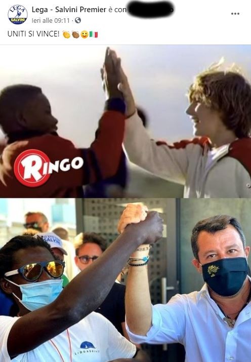 Un uso strumentale del noto marchio Ringo per la campagna elettorale della Lega? Il segretario del Carroccio è finito nuovamente al centro delle polemiche per una immagine pubblicata sui profili social della Lega Salvini Premier in cui viene utilizzato il noto slogan pubblicitario dei biscotti, “Uniti si vince”, con tanto di marchio in bella vista. Sotto l’immagine tratta dalla pubblicità c’è quindi ‘Il capitano’ che stringe la mano di un ragazzo di colore, ricalcando la celebre immagine della pubblicità.
