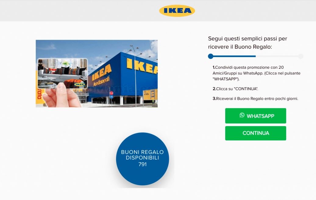 Gli utenti WhatsApp ricevono infatti un messaggio contenente un link che reindirizza ad una pagina costruita ad arte per apparire identica al sito di Ikea. Al suo interno si è obbligati a compilare un modulo di informazioni generali e al termine della procedura, per sbloccare il fantomatico buono da 250 euro, viene richiesto quindi un contributo. Per farlo è necessario inserire i dati della propria carta di credito, che una volta finita nelle mani dei criminali informatici porterà rapidamente al furto del denaro.