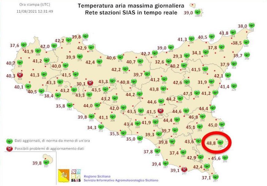 Erano state previste temperature altissime, quelle che avrebbero reso questa settimana nel cuore di agosto la più calda dell’estate. Così è stato, ed è perfino arrivato il record della temperatura più alta mai registrata in Europa. 48,8°C. Si sfiorano i 50 gradi insomma, e l’ondata è tutt’altro che finita. La temperatura senza precedenti nel continente è stata registrata a Floridia, comune in provincia di Siracusa, oggi pomeriggio alle 14:00. Il dato è stato registrato dal Servizio Informativo Agrometeorologico Siciliano (SIAS).