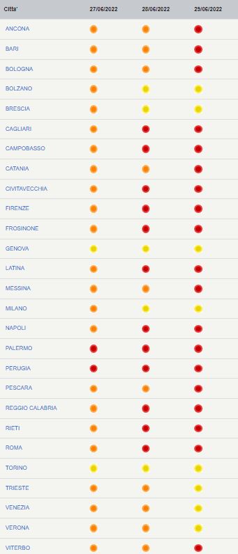 Se oggi le condizioni peggiori, quelle da bollino rosso, si registrano solo a Palermo e Perugia, è a partire da martedì 28 giugno che vi sarà una vera e propria impennata. Le città ad elevato rischio (rosse) saliranno a 12: Cagliari, Campobasso, Civitavecchia, Firenze, Frosinone, Latina, Napoli, Palermo, Perugia, Reggio Calabria, Rieti e Roma.