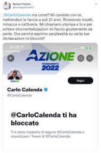 Il leader di Azione ha infatti ‘bloccato‘ l’aspirante politico sul noto social. Lo annuncia lo stesso Pastore che con un cinguettio scrive: “Carlo Calenda ma come? Mi candido con te, mettendoci la faccia a soli 21 anni. Ricevendo insulti, minacce e cattiveria. Mi chiamano stampa e tv e per evitare strumentalizzazioni mi faccio giustamente da parte. Ora perché esprimo perplessità su certe tue dichiarazioni mi blocchi?”. A corredo del post, lo ‘screenshot’ in cui si legge ‘Carlo Calenda ti ha bloccato’.