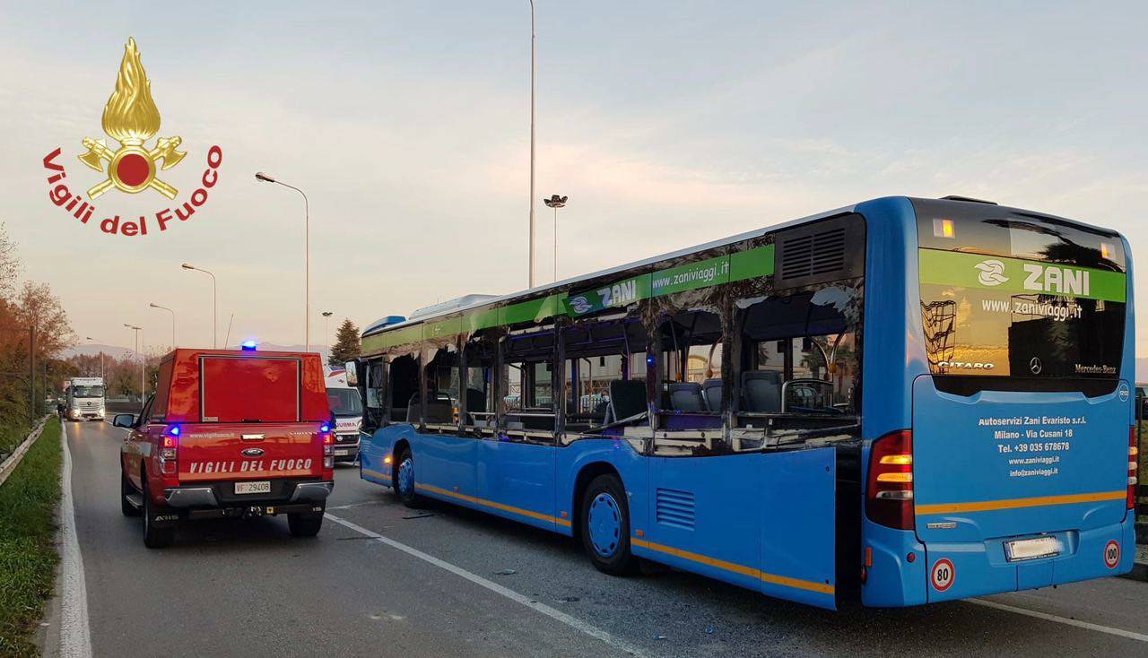 L’impatto ha distrutto tutti i finestrini della fiancata e provocato i danni alla carrozzeria. Sul posto sono intervenuti vigili del fuoco e 118 per soccorrere i feriti: quattro studenti maschi (tra i 14 e 15 anni) e una ragazza di 25 anni sono stati trasferiti all’ospedale di Seriate in codice verde.
