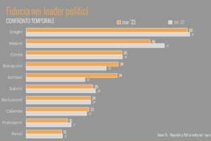 Alla domanda sull’efficacia del governo o sulla fiducia nella Presidente del Consiglio Giorgia Meloni l’indagine ha fatto registrare due dati in calo. È in calo l’efficacia, dal 50% dell’ottobre scorso al 39% attuale, ed è in calo la fiducia nella premier dal 43% dello scorso ottobre al 40% di oggi. Anche il sondaggio Quorum/Youtrend per SkyTg24 aveva fatto registrare ieri un calo nella fiducia nella premier, al 41%, che comunque resta la leader di partito più apprezzata al momento. Il giudizio sull’operato era invece risultato in crescita per chi lo ritiene “negativo”, al 49%, e in discesa per chi lo ritiene positivo, al 41%.