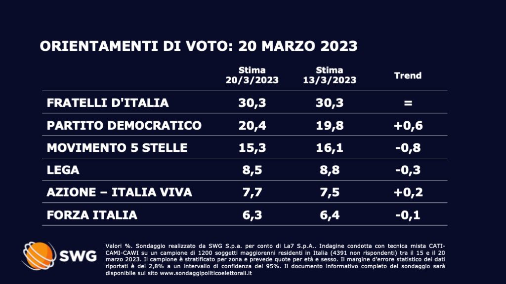 Scende il gradimento nei confronti del governo di centrodestra e nella Presidente del Consiglio Giorgia Meloni che resta comunque saldamente in testa con il suo partito Fratelli d’Italia negli orientamenti di voto degli italiani interrogati dal sondaggio SWG per il TgLa7 di Enrico Mentana diffuso nella serata di lunedì 20 marzo. Rosicchia consenso il Partito Democratico di Elly Schlein, staccato sempre di una decina di punti percentuali. Le variazioni, misurate a una settimana di distanza dall’ultima indagine, arrivano dopo la legge delega per la riforma del sistema fiscale, il congresso della CGIL e il dibattito sulle famiglie LGBTQIA+ e sulla Gestazione per altri.