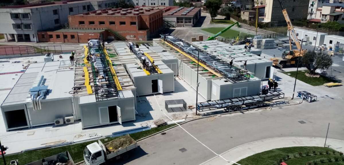 In meno di una giornata 85 operai specializzati hanno messo in piedi la prima palazzina prefabbricata che dopo Pasqua, nell’ex parcheggio dell’Ospedale del Mare, ospiterà 24 posti di terapia intensiva per pazienti Covid. Con una spesa di circa 15 milioni di euro la Regione ha realizzato a Napoli, Caserta e Salerno tre ospedali da campo. Il primo ad aprire sarà quello di Ponticelli, realizzato in un ex parcheggio dell’Ospedale del Mare: sarà attivo subito dopo Pasqua il primo prefabbricato da 24 posti letto, a cadenza settimanale saranno operativi gli altri due edifici.