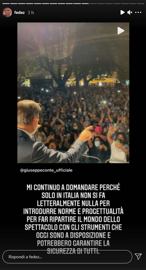 Nessuna notizia di Conte su tutto ciò. Almeno fino a oggi. “Mi continuo a domandare perché solo in Italia non si fa letteralmente nulla per introdurre norme e progettualità per far ripartire il mondo dello spettacolo con gli strumenti che oggi sono a disposizione e potrebbero garantire la sicurezza di tutti. E se da una parte il ministero dei beni culturali e il governo non fanno nulla, dall’altra veniamo deliziati da queste immagini festose che rappresentano un vero e proprio schiaffo in faccia per intere famiglie che per voi evidentemente sono inesistenti”, ha scritto Fedez, cantante e marito dell’influencer Chiara Ferragni.