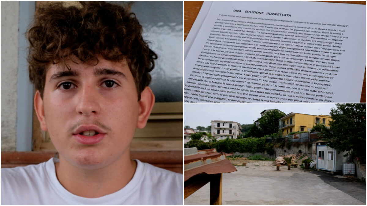 “Era il 30 settembre 2018 – scrive Castrese nel suo tema – Io ero a scuola e i miei genitori stavano vedendo la nostra casa cadere a pezzi. In quella casa c’era sudore, lacrime e sacrifici che hanno fatto i miei genitori”. Castrese è un ragazzo molto sensibile dagli occhi dolci. Mentre racconta quel dramma gli vengono le lacrime agli occhi, come se raccontandolo stesse ripercorrendo minuto per minuto il film di quella tragedia familiare. “Mi dissero che avevano buttato giù la casa – racconta – ma io non ci ho creduto finchè non l’ho vista con i miei occhi. Casa è il posto sicuro, quello che c’è sempre, e invece non c’era più. Non ho detto niente perché non volevo che i miei genitori soffrissero…già i pensieri e il dolore che avevano erano tanti”.