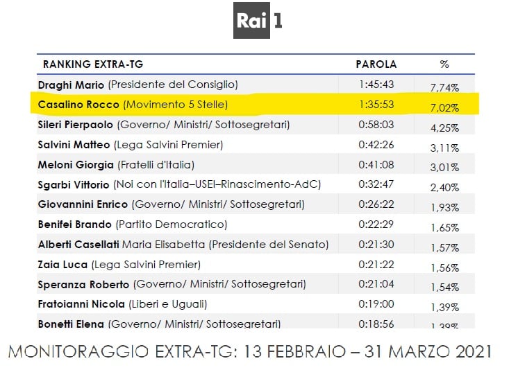 Da quando si è insediato Draghi, il politico più presente su Rai1, dopo lo stesso premier, è stato Rocco Casalino: 1h35minuti di tempo di parola sulla 1^rete Rai, 7 volte il presidente Mattarella. Ecco lo scandalo di questa Rai, ecco perché Draghi deve accelerare su rinnovo Cda. pic.twitter.com/Wg1wLSs32w