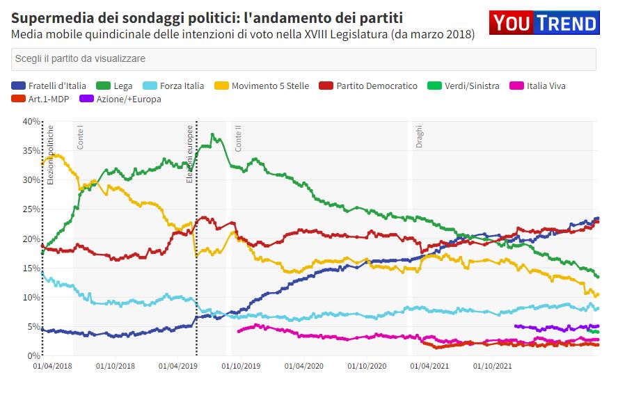 La Supermedia riporta anche l’andamento dei partiti, sulla media mobile quindicinale delle intenzioni di voto, a partire dalle ultime politiche del 2018. Drastico e inesorabile il crollo (dal 34% del 2018) del Movimento 5 Stelle, discendente anche la parabola (dal 37,7% dell’estate 2019) della Lega. Crescita esponenziale e costante di Fdi che nel marzo 2018 era al 4,4%. Piuttosto costante, anche se scossa da continue oscillazioni, la traiettoria del Pd dal 18,7% del marzo 2018. Quasi dimezzato il consenso nelle intenzioni di Forza Italia, a marzo 2018 al 14%.