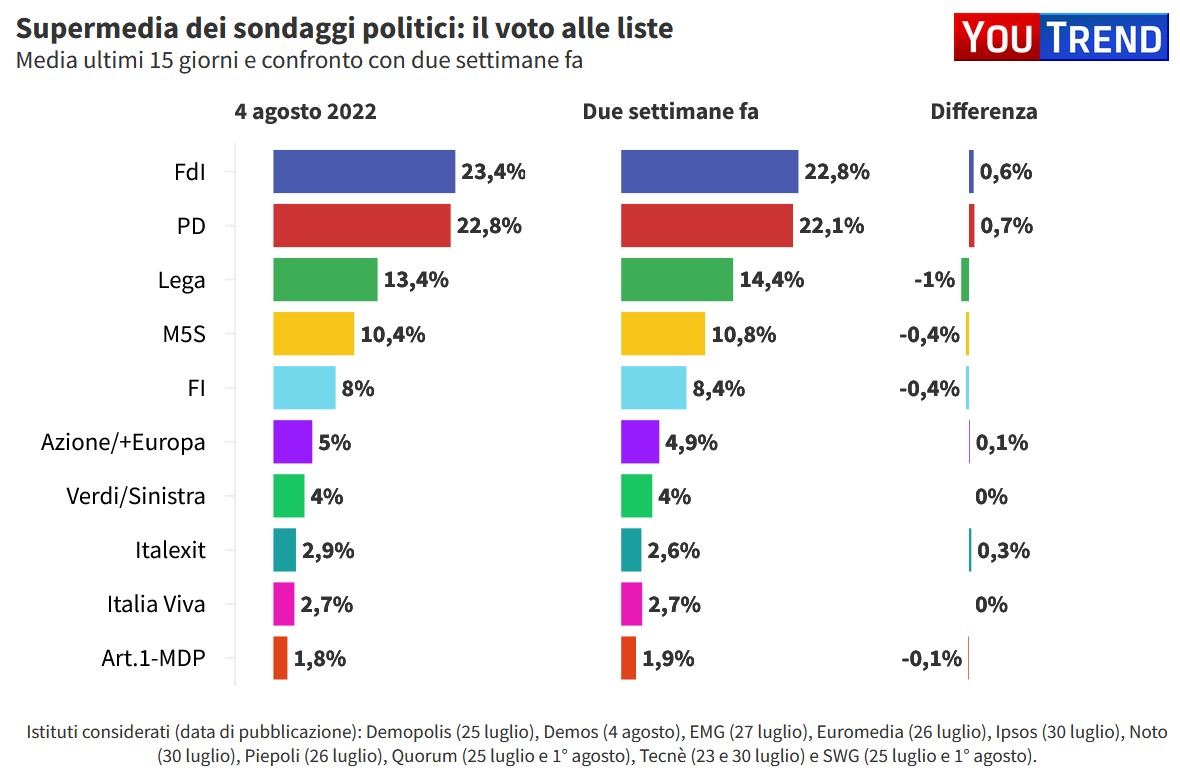 “Nelle settimane centrali di agosto, di norma, gli istituti di sondaggio si prendono una pausa. In passato, soprattutto quando il quadro politico è andato in fibrillazione durante il periodo estivo (il 2019 del ‘Papeete’) è stato possibile apprezzare variazioni non indifferenti tra il ‘prima’ e il ‘dopo’ al ritorno dalle ferie – si legge nell’articolo di commento ai dati pubblicato su Agi – È quello che ci aspettiamo di vedere anche questa volta: un’occhiata alle tendenze di lungo periodo suggerisce che potremmo trovarci a un ulteriore rafforzamento di FDI e PD, a un calo della Lega, e a un risultato che – quale che sia – potrebbe risultare decisivo per le sorti di M5S e FI, forse i partiti che in prospettiva avranno le maggiori difficoltà a proporsi come alternativa attraente agli occhi degli elettori”.