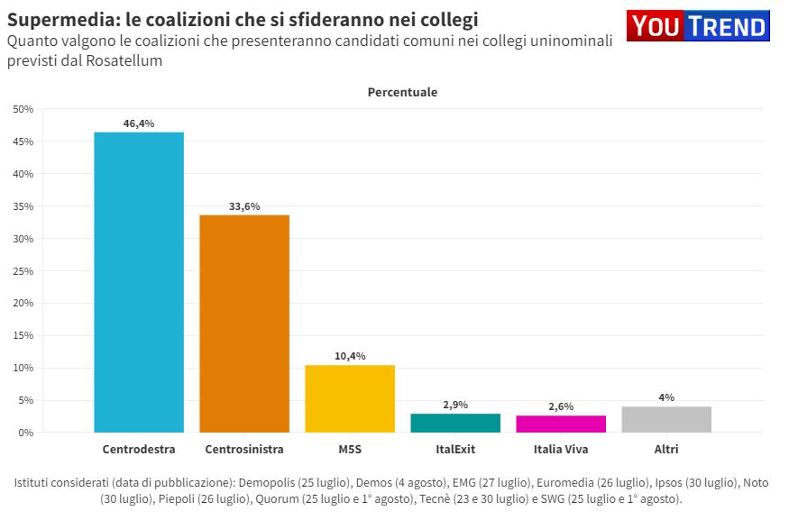 L’ultima stima riguarda le coalizioni che presenteranno candidati comuni nei collegi uninominali previsti dal Rosatellum: centrodestra al 46,4%, centrosinistra al 33,6%, M5s al 10,4%, ItalExit al 2,9%, Italia Viva al 2,6%, Altri al 4%. La Supermedia è stata calcolata a partire da una media ponderata dei sondaggi nazionali, realizzati dal 21 luglio al 3 agosto, sulle intenzioni di voto ed effettuata il 4 agosto. I sondaggi considerati sono stati realizzati dagli istituti Demopolis (data di pubblicazione: 25 luglio), Demos (4 agosto), EMG (27 luglio), Euromedia (26 luglio), Ipsos (30 luglio), Noto (30 luglio), Piepoli (26 luglio), Quorum (25 luglio e 1° agosto), Tecnè (23 e 30 luglio) e SWG (25 luglio e 1° agosto).