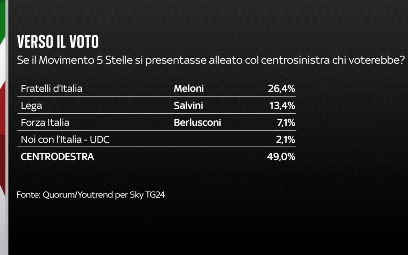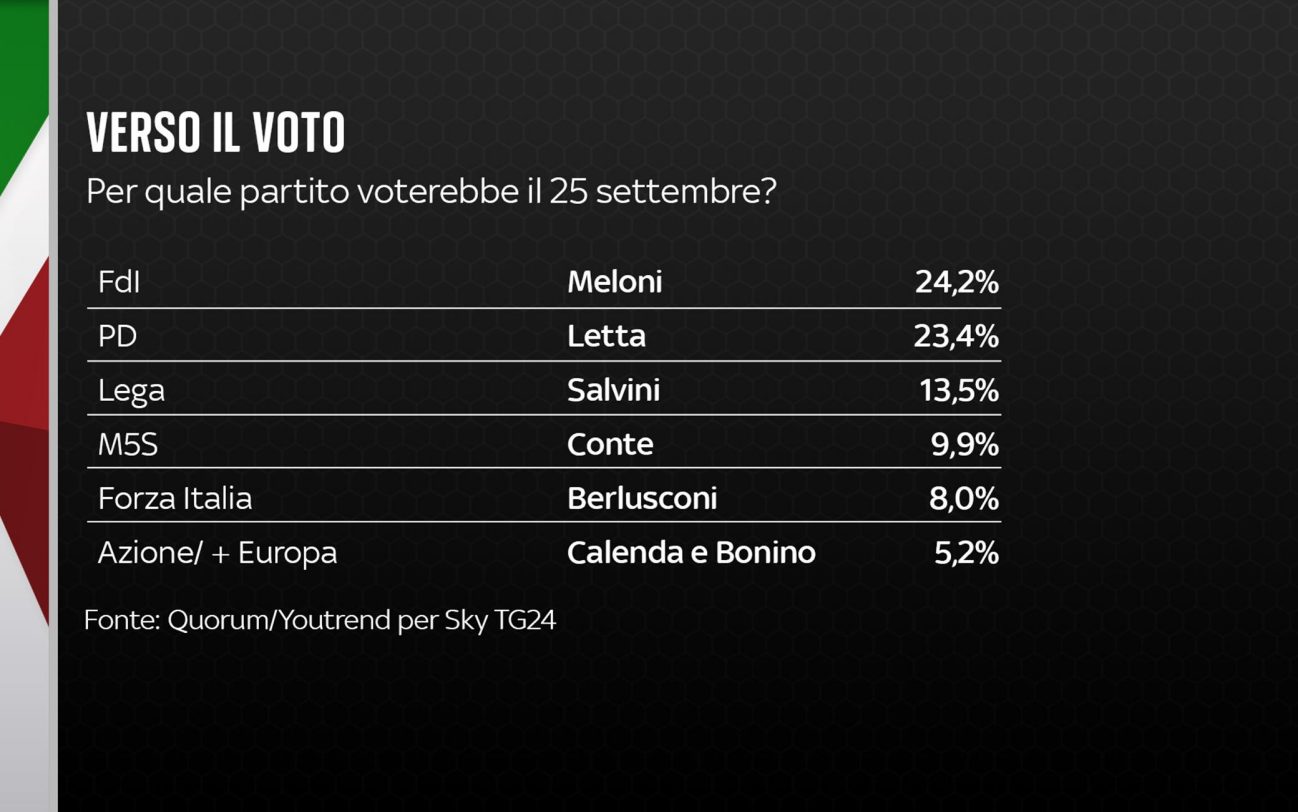 Capitolo intenzioni di voto: Fratelli d’Italia di Giorgia Meloni resta il partito da battere, al 24,2%. L’inseguimento del Pd di Enrico Letta continua, al 23,4%. Ancora in calo la Lega di Matteo Salvini, al 13,5%, e il Movimento 5 Stelle di Giuseppe Conte al 9,9%. Forza Italia all’8%, Azione/+Europa al 5,2%, SI/EV al 4%, Italia Viva al 2,6%, ItalExit al 2,6%, L’Italia c’è e Insieme Per Il Futuro all’1,8%, Noi con l’Italia/UDC allo 0,9%. Altissima la percentuale di indecisi, astenuti: 38,5%, in linea con gli altissimi tassi di astensione delle convocazioni alle urne.