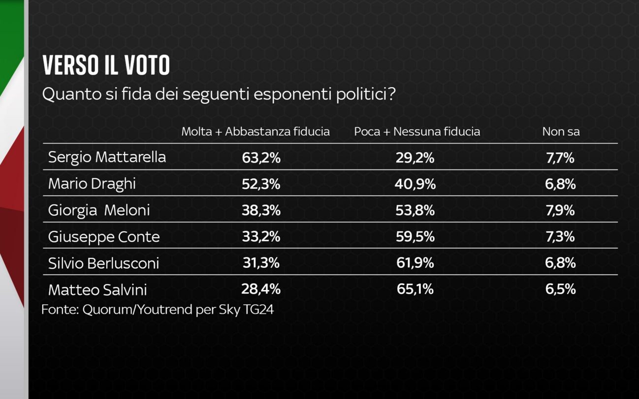 Per quanto riguarda la fiducia degli esponenti politici, nessuno schioda il Capo dello Stato Mattarella dalla vetta: chi nutre molta o abbastanza fiducia è al 63,2%. Segue Mario Draghi al 52,3%, Giorgia Meloni al 38,3%, Giuseppe Conte al 33,2%, Berlusconi al 31,3%, Enrico Letta 24,6%, Di Maio 19,3%, Calenda 16,9%, Renzi 16,2%.