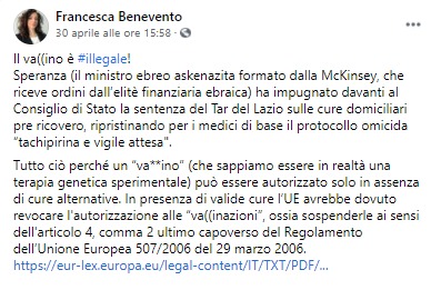 Ma Benevento, consigliera del XII Municipio di Roma, sfilatasi dal Movimento 5 Stelle nel 2019 ed ora nel gruppo Misto, non ha mai nascosto sui social network le sue posizioni antiscientifiche contro i vaccini. In uno dei post più recenti, Benevento sostiene che “Le cavie sono i popoli a cui viene fornito un racconto falsato della realtà, affinché cadano come mosche nel tranello dei vaxxini. Il loro piano è lo sterminio dei popoli“. Frasi che non lasciano adito a dubbi.