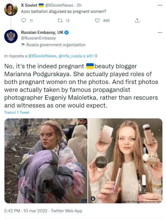 La propaganda russa ha coinvolto gli account social dell’ambasciata di Mosca in Italia. “Il tentativo di gonfiare lo scandalo attorno alla presunta distruzione da parte della Russia dell’ospedale a Mariupol è il massimo del cinismo e della campagna di menzogne sulla nostra operazione militare speciale in Ucraina”. Alcuni account hanno messo tutto in discussione a partire dalle fotografie di Marianna Podgurskaya, una donna incinta fotografata in alcuni scatti, in fuga dall’ospedale.
