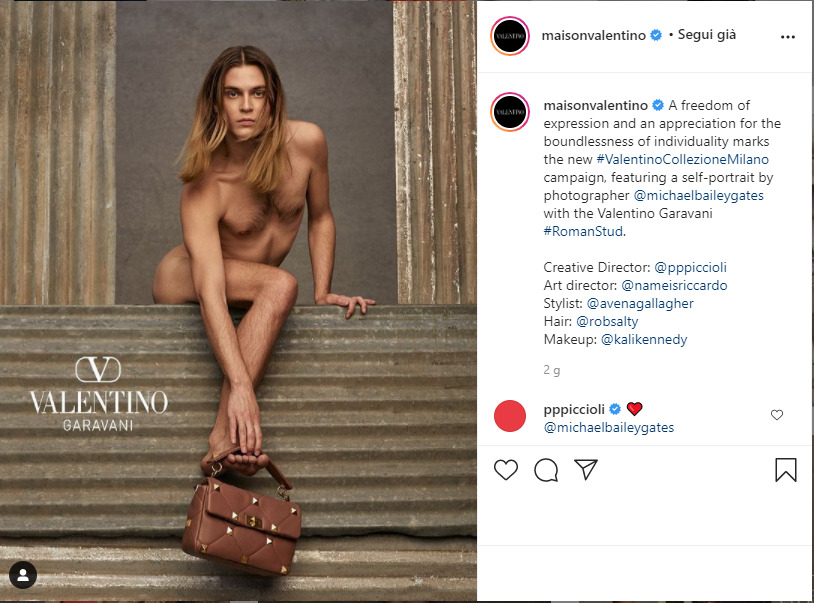 E’ uscita da poco la nuova collezione di borse di Maison Valentino, già pubblicizzata su tutti i social. Tra le tante pubblicate richiama l’attenzione la borsa grande con catena Roman Stud The Shoulder Bag in Nappa dal costo di 2.500 euro. Il direttore artistico per la campagna pubblicitaria di Maison Valentino è il 54enne Pierpaolo Piccioli che insieme alla sua squadra di lavoro ha deciso che il miglior modello per rappresentare una borsa del genere fosse Michael Bailey-Gates, che è stato il soggetto dell’idea principale della nuova campagna, ovvero: “Una libertà di espressione e un apprezzamento per l’illimitatezza dell’individualità“.