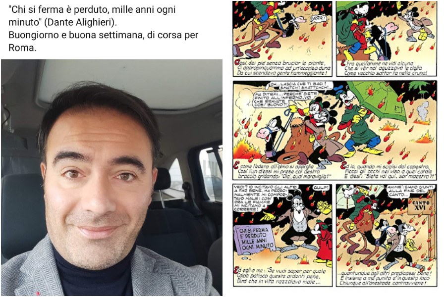 Appena nominato sottosegretario al ministero dell’Istruzione, Rossano Sasso, dello schieramento leghista, è scivolato giusto su un tema culturale. A tre giorni dalla sua nomina si esibiva su Facebook con una sua foto sorridente e una frase: “Chi si ferma è perduto, mille anni ogni minuto. (Dante Alighieri)”. Non c’è rischio di sbagliare: la frase è attribuita al sommo poeta di cui giusto in questi giorni si celebra il 700esimo anniversario della morte. Peccato che la frase in realtà sia di Topolino.
