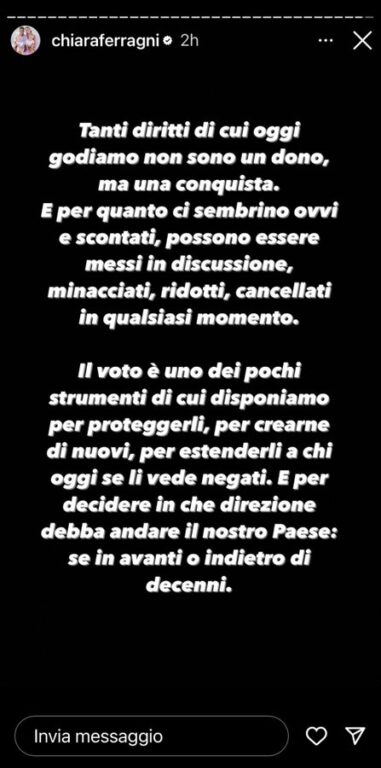 Ferragni non fa nomi di partiti o politici, ma nelle sue parole è impossibile non vedere un chiaro riferimento e una altrettanto chiara condanna al programma elettorale di Giorgia Meloni e Matteo Salvini. La nuova ‘irruzione’ politica dell’influencer si apre ricordando ai suoi followers che i “tanti diritti di cui oggi godiamo non sono un dono ma una conquista. E per quanto ci sembrino ovvi e scontati, possono essere messi in discussione, minacciati, ridotti, cancellati in qualsiasi momento”.