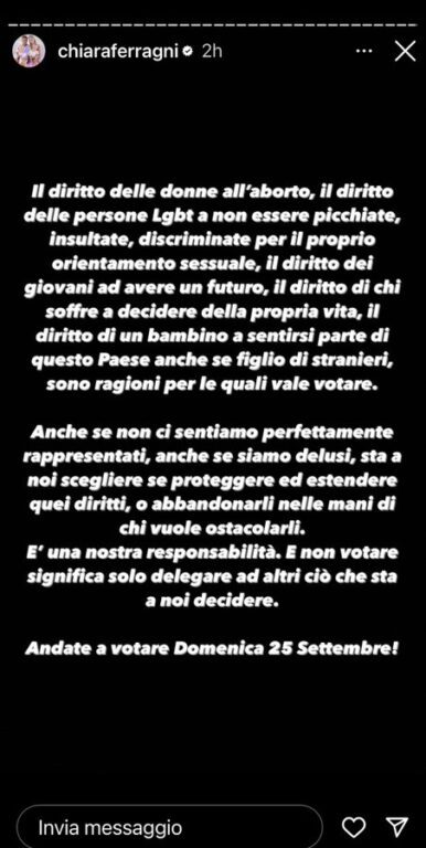 Sono infatti i temi a definire la posizione della Ferragni, che si rivolge ralla sua platea fatta di quasi 28 milioni di followers su Instagram per parlare di diritti civili, dall’aborto al fine vita, dalla cittadinanza ai bambini figli di migranti alle discriminazioni contro le persone Lgbt. Un appello che si conclude con parole chiare, “Andate a votare domenica 25 settembre”, mentre gli ultimi sondaggi pubblicabili davano un fronte dell’astensionismo sempre più vasto.