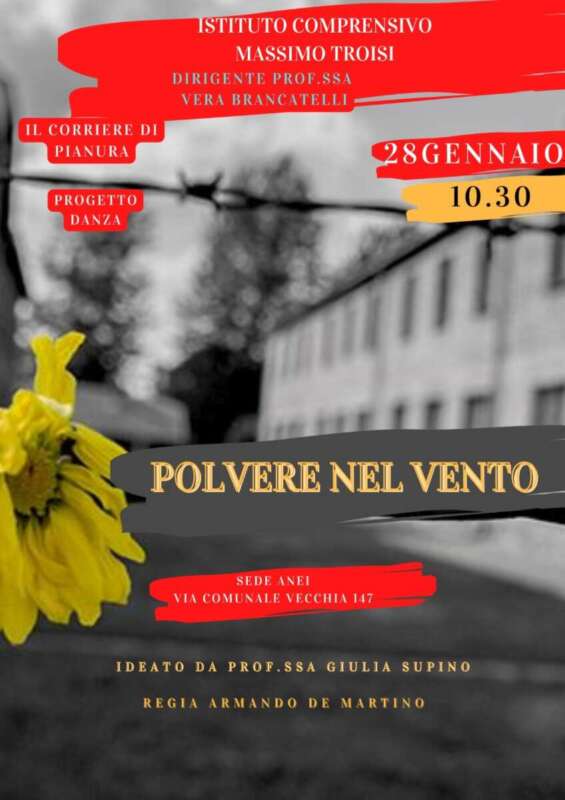 Lo spettacolo dei giovani studenti della III D della scuola Massimo Troisi, guidata dalla dirigente Vera Brancatelli, è in programma domani (28 gennaio) alle 10.30 nel centro ANEI (Associazione Nazionale Ex Internati) in via Comunale Vecchia (ingresso gratuito). Uno spettacolo ideato dalla professoressa Giulia Supino con la collaborazione de Il Corriere di Pianura e di Progetto Danza. Una commistione di generi, musica, teatro, arte e ricordo attraverso le performance artistiche dei giovani studenti della scuola pianurese. Un momento di riflessione alto che parte dal quartiere di Pianura sempre attento a tematiche delicate e a proposte culturali che lo hanno reso una delle periferie più attive culturalmente a Napoli.