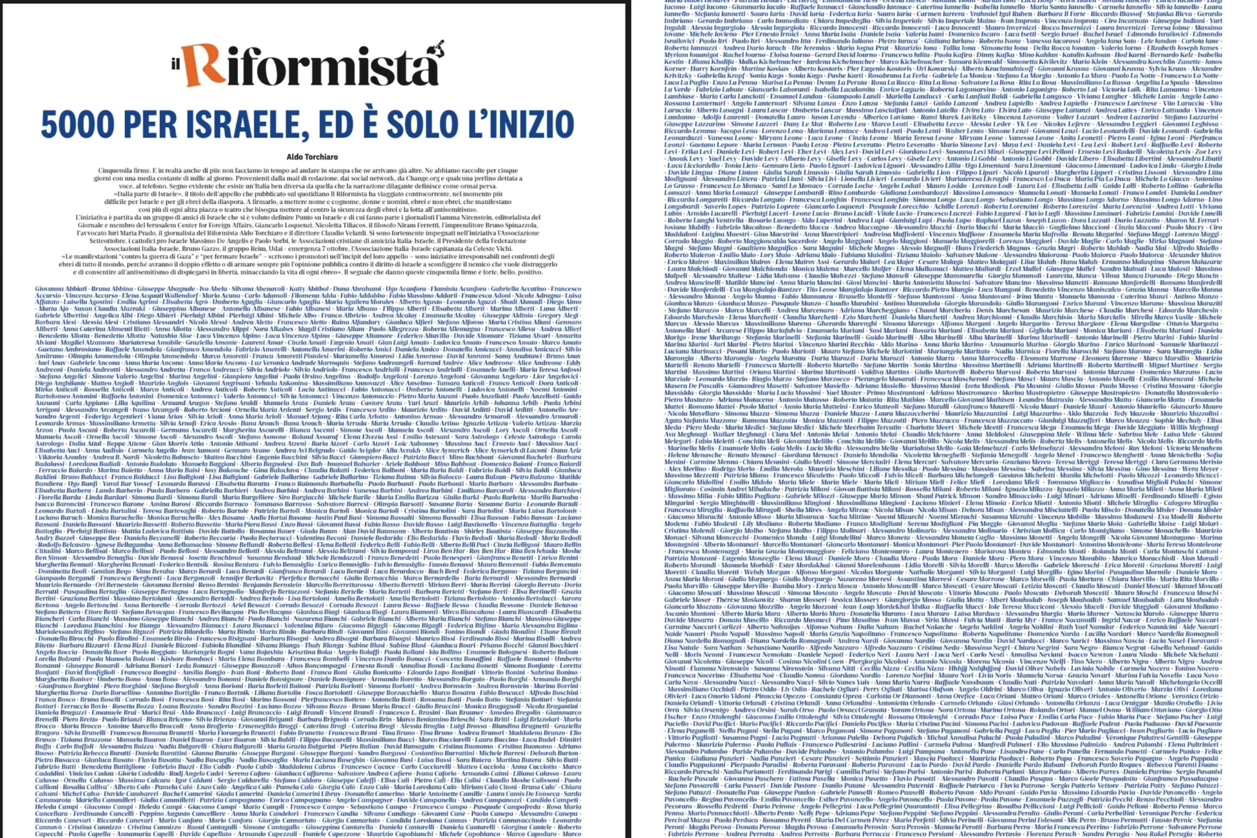 «Dalla parte di Israele», il titolo dell’appello che pubblicato sul quotidiano Il Riformista ha viaggiato controcorrente, nel momento più difficile per Israele e per gli ebrei della diaspora. A firmarlo, a mettere nome e cognome, donne e uomini, ebrei e non ebrei, che manifestano così più di ogni altra piazza o teatro che bisogna mettere al centro la sicurezza degli ebrei e la lotta all’antisemitismo. L’iniziativa è partita da un gruppo di amici di Israele che si è voluto definire Punto su Israele e di cui fanno parte i giornalisti Fiamma Nirenstein, editorialista del Giornale e membro del Jerusalem Center for Foreign Affairs, Giancarlo Loquenzi, Nicoletta Tiliacos, il filosofo Niram Ferretti, l’imprenditore Bruno Spinazzola, l’avvocato Iuri Maria Prado, il giornalista del Riformista Aldo Torchiaro e il direttore Claudio Velardi.