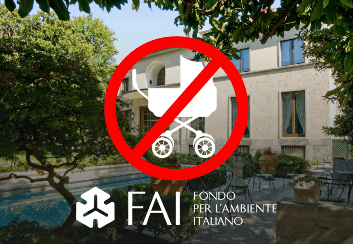 Abbiamo quindi chiesto quali fossero le politiche di inclusione del FAI per le persone in carrozzina, se anche loro, per analogia, fossero escluse dal vivere l’esperienza FAI e l’ingresso in carrozzina (per fortuna) è ammesso. Sconcertati da questa disparità di trattamento, verifichiamo anche il sito ufficiale del FAI e di Villa Necchi Campiglio ed effettivamente è specificato (sezione “accessibilità”) che le sedie a rotelle posso entrare, ma non i passeggini (sezione “informazioni utili”).