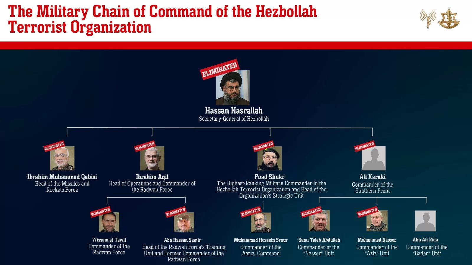 Con la morte di Nasrallah, confermata nelle scorse ore anche da Hezbollah, l’esercito israeliano afferma che “la maggior parte” dei leader militari del partito di Dio è stata uccisa. Su X, l’Idf ha diffuso un organigramma dei vertici di Hezbollah con 18 nomi, incluso quello di Nasrallah, apponendo su ognuno di essi la scritta ‘eliminated‘.