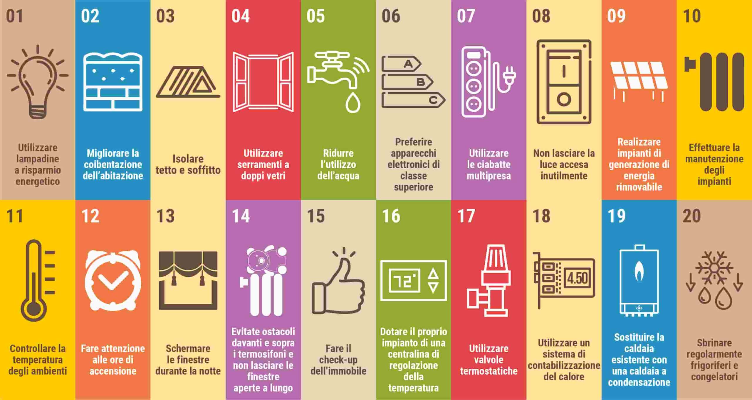 Poi è importante anche l’utilizzo di elettrodomestici e dispositivi ad alta tecnologia. Ad esempio, una nuova caldaia a condensazione consuma meno gas, oppure si può direttamente sostituire la caldaia a gas con le pompe di calore alimentate da energia elettrica. In quest’ultimo caso il risparmio sarebbe di oltre 400 euro l’anno. Anche sostituire i vecchi elettrodomestici con modelli più performanti è una buona idea, ad esempio passare da un frigorifero di classe G a uno di classe A toglie 84 euro dalla bolletta.